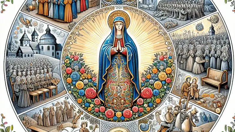 Pierwszym istotnym wątkiem jest motyw religijny. Bogurodzica jest hymnem maryjnym, którego treść skupia się na modlitwie do Matki Bożej. Utwór ten wyraża głęboką pobożność i oddanie wobec Maryi, co stanowi istotny element tradycji katolickiej. Bogurodzica przedstawia Matkę Boską jako ważną postać o niezwykłej mocy, która jest w stanie pomóc w trudnych chwilach i chronić przed złem. Wątek religijny jest tym samym istotnym zobrazowaniem wiary i roli, jaką odgrywa Maryja w życiu wielu osób.