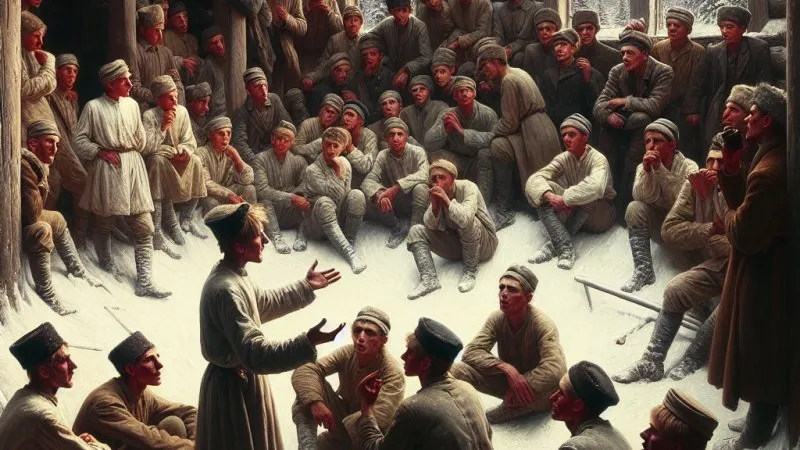 W rozmowie między młodymi więźniami ujawniają się ich osobiste losy i przemyślenia. Widzimy, jak trudne warunki życia na Syberii wpływają na ich psychikę, ale jednocześnie obserwujemy, że młodzież nie traci wiary w swój naród i dąży do wolności. Zadziwiający jest ich umysłowy paroksyzm - zdolność do refleksji, filozofowania i snucia wizji lepszego jutra pomimo okropności, jakich doświadczają.