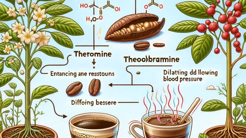 Teobromina, mniej znana od kofeiny, jest głównym alkaloidem występującym w kakao i czekoladzie. W porównaniu do kofeiny, ma bardziej łagodne i dłużej trwające działanie stymulujące. Mechanizm działania teobrominy jest podobny do kofeiny, ponieważ także wpływa na centralny układ nerwowy, ale działa zarówno na receptory adenozynowe, jak i na inne procesy biochemiczne w ciele, takie jak zwiększenie arteriolar vasodilation czy wpływ na poziom wapnia wewnętrzkomórkowego.