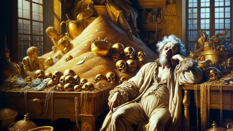 Podsumowując, jasno widać, że Molier w "Skąpcu" argumentuje, iż bogactwo materialne samo w sobie nie jest gwarancją szczęścia. Wręcz przeciwnie, obsesja na punkcie dóbr materialnych może prowadzić do upadku moralnego i emocjonalnego, co Harpagon doskonale ilustruje. W obliczu tego dramatu właściwym wydaje się podejście, które stawia na równowagę między życiem materialnym a duchowym, doceniając, że prawdziwe bogactwo tkwi w ludzkich relacjach i zadowoleniu z prostych przyjemności życia.