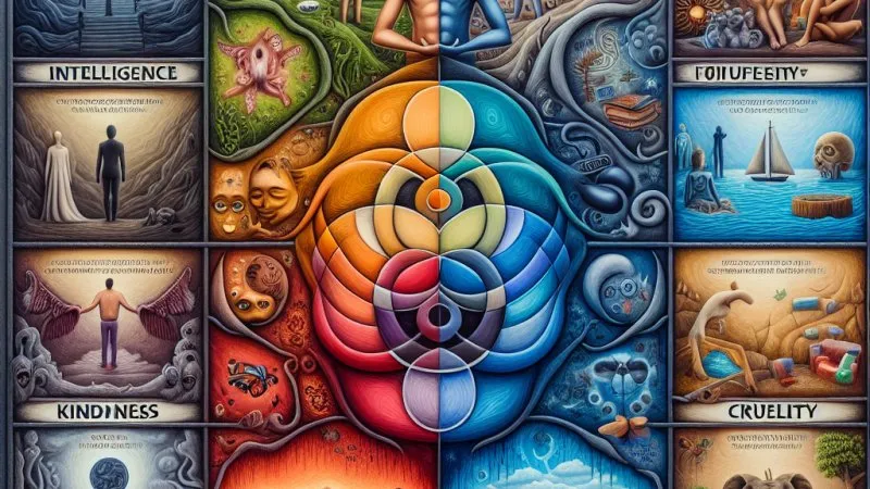Nagromadzenie sprzeczności w człowieku można zaobserwować na wielu płaszczyznach jego istnienia. Rozważmy na przykład aspekt moralny. Człowiek potrafi być jednocześnie bardzo życzliwy i pomocny dla innych, a jednocześnie zaskakująco okrutny i nielitościwy. Widzimy to, gdy podczas wojen dochodzi do ludobójstw i masowych mordów, ale również w naszym codziennym życiu, gdy jeden człowiek jest zdolny pomóc drugiemu w potrzebie, podczas gdy kolejny może okrutnie znęcać się nad bezbronnymi istotami.