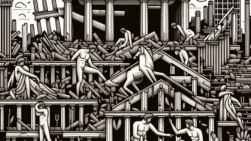 "Iliada" Homera, jedna z najważniejszych epickich opowieści literatury klasycznej, opisuje nie tylko heroiczne zmagania bohaterów, ale również skomplikowane procesy prowadzące do upadku Troi. W tej epopei miasto Troja staje się symbolem upadku świata, reprezentując zarówno fizyczną, jak i moralną degradację. Proces ten nie jest gwałtowny ani jednowymiarowy – jest to stopniowy, złożony upadek, którego geneza i skutki mają głębokie korzenie w decyzjach i postępkach jego mieszkańców. Entropia, rozumiana jako nieuchronny proces degeneracji, jest nierozerwalnym elementem istnienia każdej cywilizacji – od starożytnego Egiptu po współczesność. Troja, równa potęgą i bogactwem piramidom w Gizie, ostatecznie musiała ustąpić przed nieuchronnym rozpadem, jak każda inna wielka cywilizacja.