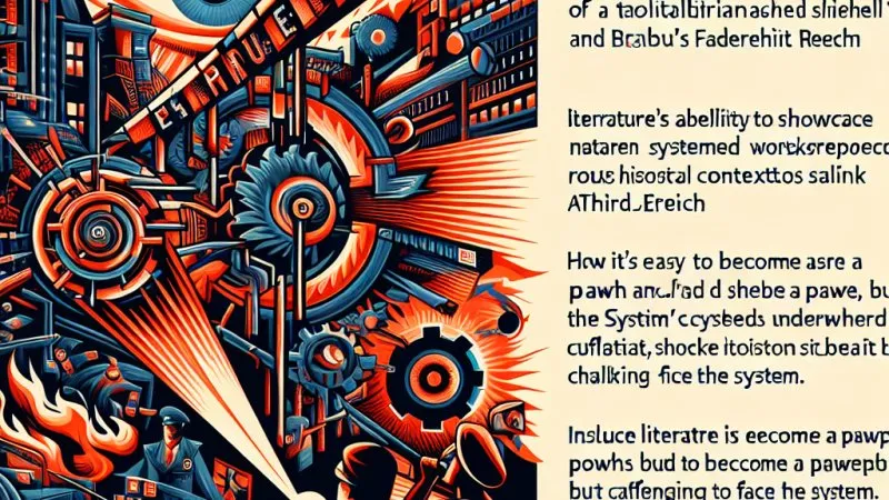 Właściwości literatury to pokazywanie rzeczywistości i obnażanie mechanizmów systemu totalitarnego. Przykłady to "Rok 1984" Orwella i "Fahrenheit 451" Bradbury'ego oraz konteksty historyczne, jak III Rzesza. Literatura uświadamia nam, że łatwo stać się pionkiem, ale trudno stawić czoło systemowi. ✅