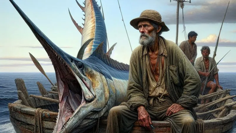 Minęło już siedem dni, odkąd wróciłem na ląd z mojej ostatniej wyprawy, która okazała się równie triumfalna, co gorzka. *** Do dziś mam przed oczami ten widok – olbrzymi szkielet marlina, moje największe trofeum, którego jednak nie udało mi się w pełni ocalić. Każdego dnia, kiedy przechadzam się po wiosce, słyszę szepty i wzdychnięcia mieszkańców, którzy spoglądają na to, co pozostało z mojej zdobyczy. *** Wciąż pamiętam ten dzień, kiedy po długiej walce z marlinem, pełen dumy i wyczerpania, wróciłem do osady. Ludzie tłumnie zebrali się na plaży, aby zobaczyć olbrzyma, którego udało mi się złowić. Jednak nie było tam już całego marlina – pozostał jedynie jego szkielet, symbolem nie tylko mojej chwały, ale i tragedii. Spojrzenia pełne zdumienia i nieufności, pytania bez odpowiedzi – to wszystko mieszało się z moim wewnętrznym bólem. Byłem dumny z tego, co osiągnąłem, ale czułem również głęboką gorycz – przecież to, co najważniejsze, zostało mi odebrane przez rekiny.