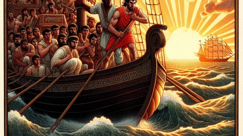 Odyseusz podczas długiej podróży do Itaki zmaga się z przeciwnościami losu, walczy ze strachem i zagrożeniami, jednocześnie kierując swoją załogą. Mimo wewnętrznych niepokojów nie traci nadziei na powrót do rodzinnego domu. ?⚓️