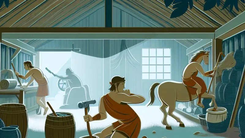 Herakles podjął się trudnego zadania czyszczenia stajni Augiasza, realizując je dzięki sprytnemu planowi z wykorzystaniem naturalnych zasobów. Pomimo braku uznania, pokonał przeciwności losu i zemścił się na królu Elidy.