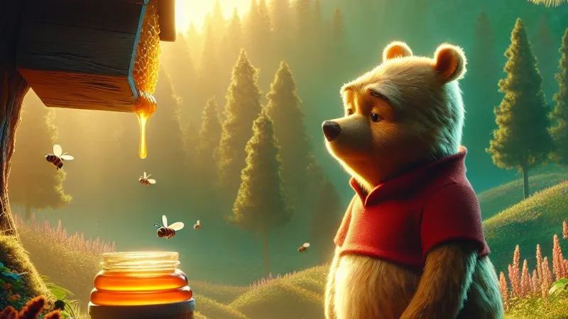 Kubuś Puchatek, przyjaciel z Stumilowego Lasu, próbuje zdobyć miód, ucząc się o przyjaźni i wsparciu w trudnych chwilach. ?✨