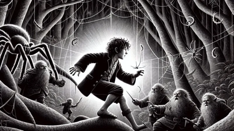 Mroczna Puszcza przynosi grozę. Bilbo, podążając za Thorinem, walczy z pająkami, ratuje krasnoludy i staje się bohaterem, zyskując odwagę i pewność siebie. ?️✨