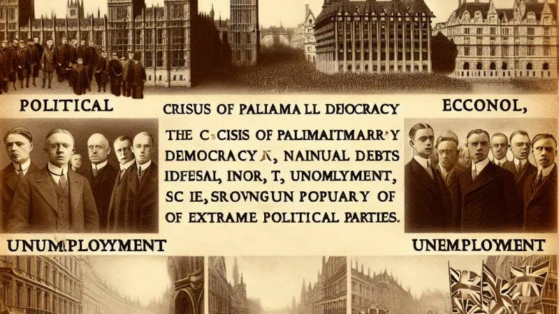 Kryzys demokracji parlamentarnej w Europie międzywojennej był wynikiem zadłużenia państw, inflacji, bezrobocia i nastrojów społecznych. Wzrost popularności ekstremistycznych partii politycznych i podziały społeczne dodatkowo przyczyniły się do pogorszenia sytuacji. ?