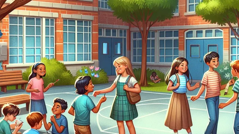 Przerwa to czas odpoczynku i relaksu dla uczniów. Grupa przyjaciół spotyka się na dziedzińcu szkolnym, bawi się, rozmawia i relaksuje. Świeże powietrze i widok zieleni dodają energii. Każdy znajduje dla siebie formę rozrywki, np. gra w kalambury. Przerwa to również moment na nawiązywanie relacji i wzmocnienie więzi z przyjaciółmi. Jest to jeden z najbardziej oczekiwanych momentów w ciągu dnia. ✅