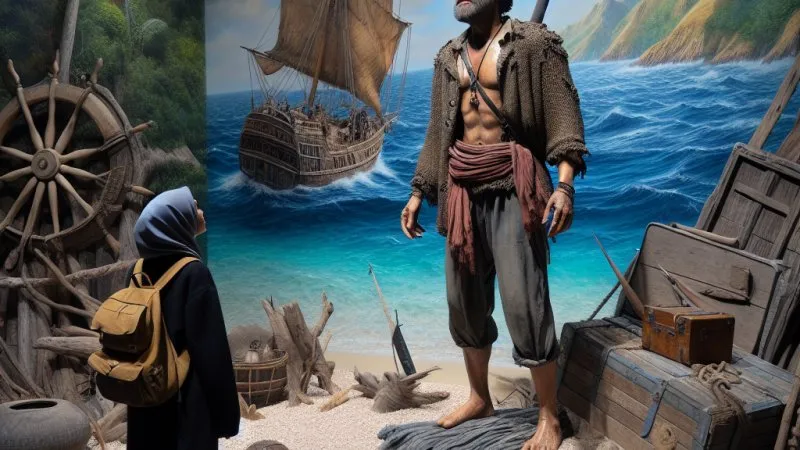 Spotkanie z Robinsonem odbyło się w zupełnie nieoczekiwanych okolicznościach. Byłem na wycieczce szkolnej w muzeum, gdzie właśnie odbywała się wystawa poświęcona wielkim odkrywcom i podróżnikom. Niespodziewanie, stojąc przed makietą wyspy, na której Robinson spędził wiele lat, usłyszałem głos mówiący po angielsku. Odwróciłem się i zobaczyłem niezwykle realistyczną figurę Robinsona Crusoe, który zdawał się wyjść prosto z kart książki.