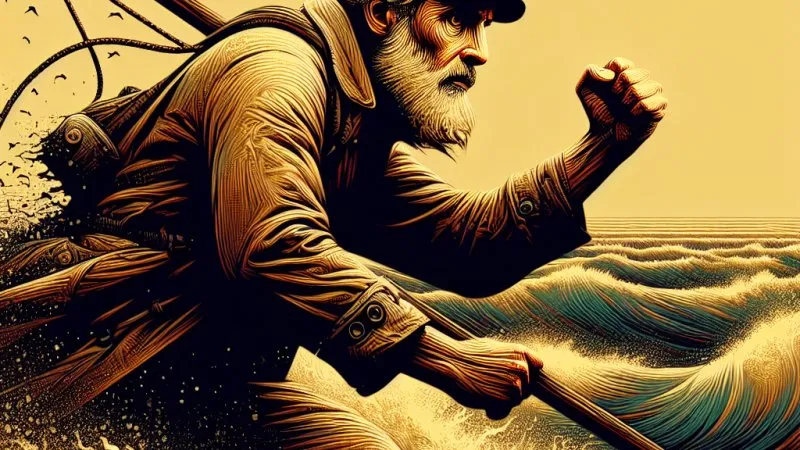 Santiago jest rybakiem, który od długiego czasu nie złowił żadnej ryby. Mimo to nie rezygnuje, a jego zaangażowanie i determinacja wychodzą na jaw, kiedy wyrusza w morze i staje do walki z olbrzymim marlinem. Ta walka, trwająca kilka dni i nocy, jest nie tylko fizycznym wysiłkiem, ale także głębokim duchowym doświadczeniem dla starca. Santiago w swoim wytrwaniu, mimo starości i zmęczenia, udowadnia, że prawdziwa odwaga to nie brak strachu, ale umiejętność stawienia czoła wyzwaniu w obliczu przeciwności.