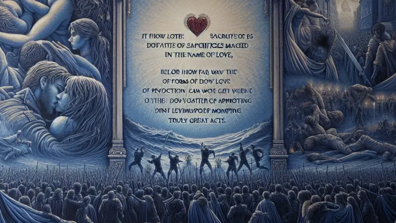 Jednym z najbardziej rozpoznawalnych przykładów poświęcenia w imię miłości jest historia Romea i Julii autorstwa Williama Shakespeare’a. Młodzi kochankowie, pochodzący z zwaśnionych rodów - Montekich i Kapuletów, decydują się na tajne małżeństwo. Ich miłość jest tak silna, że są gotowi zrezygnować ze swoich wcześniej ustalonych ścieżek życiowych, ryzykować reputacją a nawet życiem. Ich tragiczne poświęcenie kończy się śmiercią obydwu, co miało stanowić próbę uniknięcia konfliktu i zapoczątkowania nowego, wspólnego życia. To przesłanie jest uniwersalne, podkreślając, jak daleko można się posunąć w imię miłości.