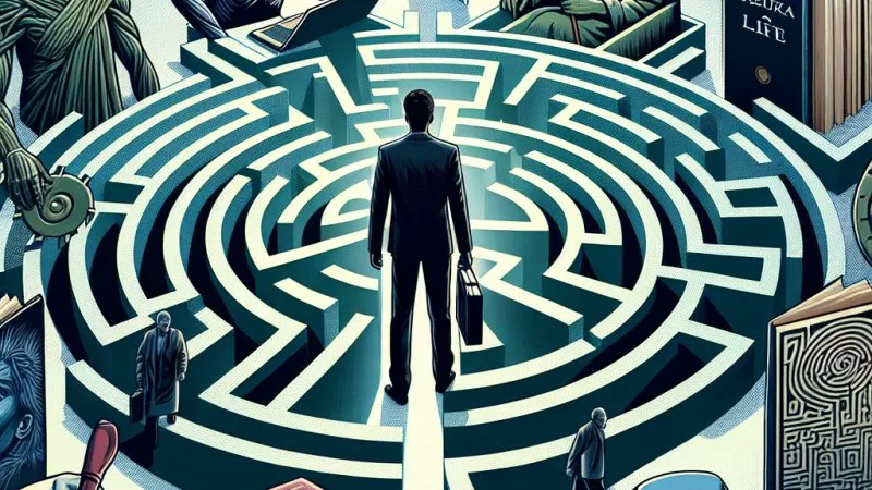 Jednym z utworów, który ukazuje człowieka w rozmaitych kontekstach labiryntu życia, jest powieść Franza Kafki "Proces". Główny bohater, Józef K., zostaje oskarżony o przestępstwo, którego nie popełnił. To sprawia, że jego życie zamienia się w zawiłą sieć absurdalnych i nieprzyjemnych sytuacji. Próbuje on rozgryźć sens swojego procesu, ale wraz z postępem akcji staje się coraz bardziej zagubiony w labiryncie biurokracji i niedających się zrozumieć przepisów. Powieść ta ukazuje, jak człowiek może być zmuszony zmierzyć się z olbrzymią i nieprzewidywalną siłą systemu, która stanowi dla niego labirynt, z którego trudno znaleźć wyjście.