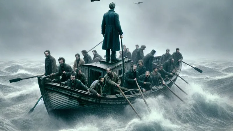 Bohaterowie stoją przed wyborem poświęcenia jednego z nich dla przeżycia, co ilustruje egzystencjalne pytania o odpowiedzialność i autentyczność.