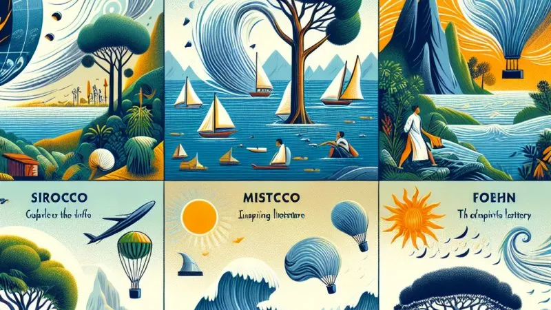 Z kolei Mistral to zimny i suchy wiatr wiejący z północy w dolinie Rodanu we Francji. Mistral jest często wspominany w literaturze francuskiej, na przykład u Marcela Pagnola. Uważa się, że mistral przynosi ze sobą czyste, przejrzyste powietrze, ale jednocześnie może być niezwykle silny, co może prowadzić do zniszczeń, zwłaszcza w rolnictwie.W literaturze mistral jest często przedstawiany jako symbol siły natury, która niezależnie od ludzkich intencji formuje życie mieszkańców regionu. Jest również źródłem inspiracji dla twórców związanych z Prowansją, gdzie wpływ mistralu jest odczuwalny na co dzień.