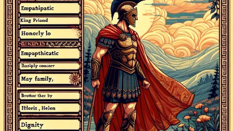 Hektor - bohater mitologii greckiej, syn Priama i Hekabe, brat Parysa i Heleny. Odważny wojownik i przywódca, troszczył się o swoją rodzinę i naród. Pełen empatii, honoru i lojalności. Jego postać ukazuje wartość poświęcenia i godności. Wpływowy bohater mitologii greckiej. ✅