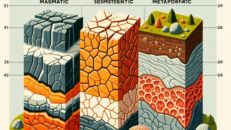 Skały magmowe, często określane jako skały plutoniczne lub wulkaniczne, wyłaniają się w wyniku krystalizacji magmy – stopionej skały, która znajduje się w głębi Ziemi. Proces ten rozpoczyna się, kiedy magma penetruje skorupę ziemską, gdzie ulegając ochłodzeniu, zaczyna krystalizować. Pod względem miejsca i szybkości ochładzania, skały magmowe dzielą się zasadniczo na dwa typy: plutoniczne i wulkaniczne.Skały plutoniczne, takie jak granit, tworzą się na dużych głębokościach, gdzie proces powolnego ochładzania magmy pozwala na rozwój dużych, dobrze wykształconych kryształów. W przeciwieństwie do nich, skały wulkaniczne, jak bazalt, powstają na powierzchni Ziemi, gdzie wystawione są na działanie atmosfery, co prowadzi do szybkiego ich stygnięcia. W efekcie, kryształy w bazalcie są znacznie mniejsze.