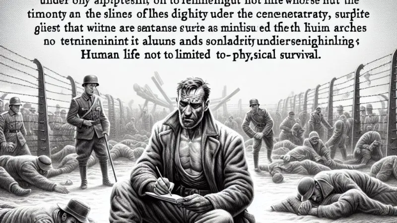 Praca opisuje historię bohatera, który w czasie wojny szukał sensu życia i godności w obozach koncentracyjnych. Autor podkreśla ważność zachowania wartości i solidarności w trudnych warunkach. Życie człowieka nie ogranicza się tylko do fizycznego przetrwania. ?