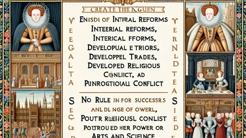 Panowanie Elżbiety I (1558-1603) to okres pełen zmian politycznych, kulturalnych i religijnych. Królowa wprowadziła reformy wewnętrzne, rozwijała handel i górnictwo, uniknęła konfliktu religijnego, patronowała sztuce i nauce. Jej rządy przyniosły wzrost potęgi i sukcesy dla Anglii. ✅