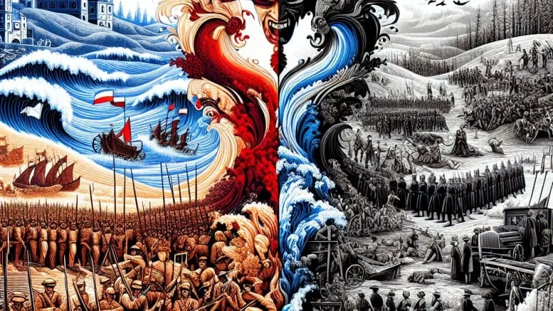 Henryk Sienkiewicz w „Potopie” przyjmuje zupełnie inne podejście do przedstawienia historii. Jest to druga część słynnej „Trylogii”, której akcja osadzona jest w czasach potopu szwedzkiego – jednego z najtragiczniejszych epizodów w historii Polski. Sienkiewicz, opierając się na licznych kronikach i źródłach historycznych, powołuje do życia barwny świat XVII-wiecznej Rzeczypospolitej. Wykorzystując techniki epickie, przekształca fakty historyczne w emocjonującą narrację pełną przygód, walki i dramatycznych zwrotów akcji. Bohaterowie, jak Andrzej Kmicic, reprezentują nie tylko idee patriotyzmu i honoru, ale także osobiste dylematy moralne. Sienkiewicz, idealizując niektóre postaci i wydarzenia, z jednej strony oddaje hołd polskiej tradycji rycerskiej, z drugiej zaś wskazuje na konieczność jedności i determinacji w obliczu zagrożeń. W efekcie „Potop” nie tylko bawi, ale i edukuje, przypominając o potrzebie odwagi i wierności ideałom w trudnych chwilach.