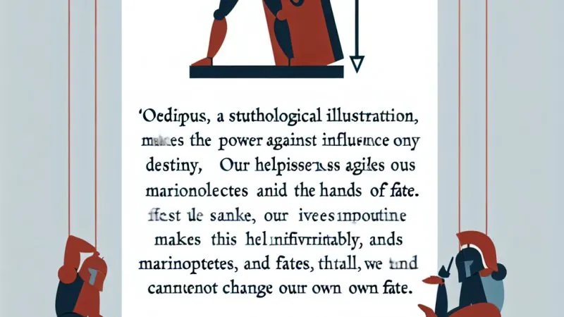 Edyp, bohater mitu, ukazuje siłę i siłę wpływu przeznaczenia na życie człowieka. Bezsilność wobec losu sprawia, że jesteśmy marionetkami w rękach przeznaczenia. Przez całe życie mierzymy się z nieuniknionym i nie możemy zmienić swojego losu.