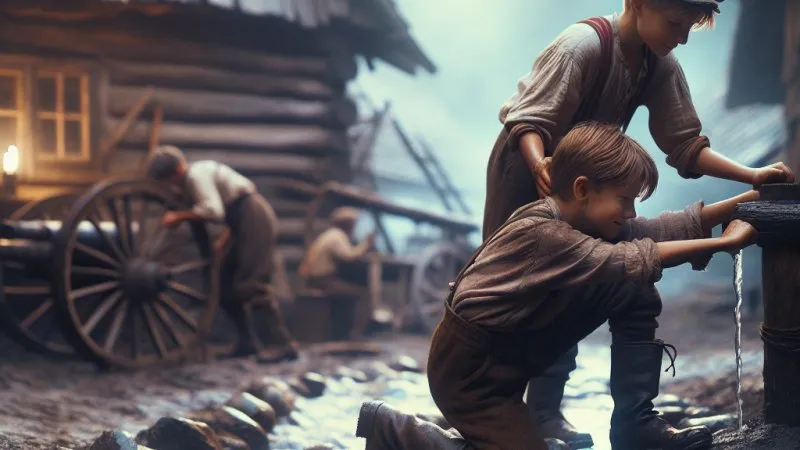 Janek i Staszek, przyjaciele z wioski Ostrze, wspólnie pokonali trudności, by sprowadzić wodę do wioski, pokazując siłę prawdziwej przyjaźni. ??