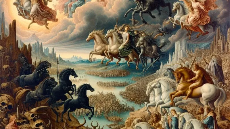 Jednym z najbardziej znanych symboli „Apokalipsy” są Czterej Jeźdźcy Apokalipsy, którzy zapowiadają różne katastrofy nękające ludzkość. Są to: Biały Jeździec, często identyfikowany z Chrystusem, przynoszący zwycięstwo, Czerwony Jeździec zwiastujący wojnę, Czarny Jeździec, symbolizujący głód, oraz Blady Jeździec, utożsamiany ze śmiercią. Każdy z nich niesie ze sobą destrukcję, która ma znaczenie zarówno dosłowne, jak i symboliczne.